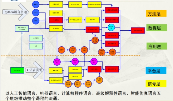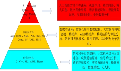 以三类语言贯通课程体系,如图5-4所示,推动课程的衔接,满足学生的不同层次和目标需求。底层学习信号层语言,如C、C++、ML、ARM、Thumb,对应信号和平台类课程,如计算机网络与无线通信、现代通信原理、信号系统分析、智能终端技术、智能系统开发、操作系统、微机原理、无人机,使得学生具有基本、核心、可延展的智能硬件基础知识;中层学习数据层语言,如Java、HTML、XML、Perl、Shell、SQL、Query、C#、UML、SPSS,对应数据类课程,如数据仓库与数据挖掘、大数据与领域建模、数据库、WEB数据库、数据结构与算法分析、数据可视化技术、软件工程、区块链与电子货币,使得学生具有全面、完整、极丰富的数据处理知识;高层学习人工智能语言,如Python、List、Prolog、Matlab、R,对应人工智能方法学类课程,如机器学习、神经网络、模式识别、数字图像处理、语音智能识别、智能商务系统、互联网金融、金融数据分析,使得学生具有精细、特色、超前的人工智能方法学知识和技能。