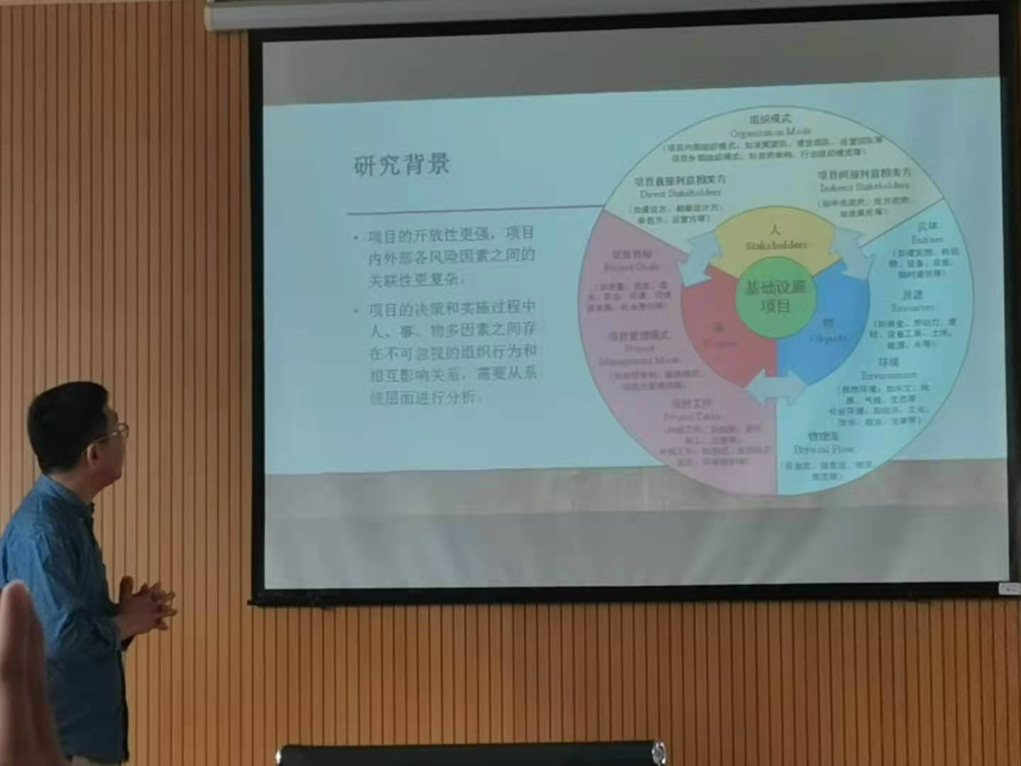 汪涛首先从“元网络”的研究背景出发,讲述了一个项目开展过程中会碰到的人、事、物三大部分的影响因素,通过因素影响的复杂性,从而论证了“元网络”研究的重要意义。随后,汪涛讲解了元网络分析的基本思路——解构风险事件。首先确定项目目标,然后找到风险事件,再找出可能导致风险事件的风险因素,而因素部分是最为复杂的,需要继续逐步分析,寻找可控的风险因素。在完成了理论部分的讲解后,汪涛通过两篇他负责过的项目论文来实际讲解元网络分析的全过程。