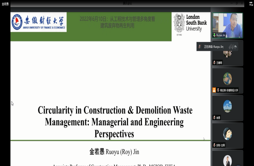 2022年6月10日下午,英国伦敦南岸大学金若愚副教授在线开展题目为“从工程技术与管理多角度看建筑废弃物再生利用”的学术交流讲座,73882必赢最新官网院长戴道明主持,学院老师及研究生踊跃参与了本次讲座,并进行深入交流。