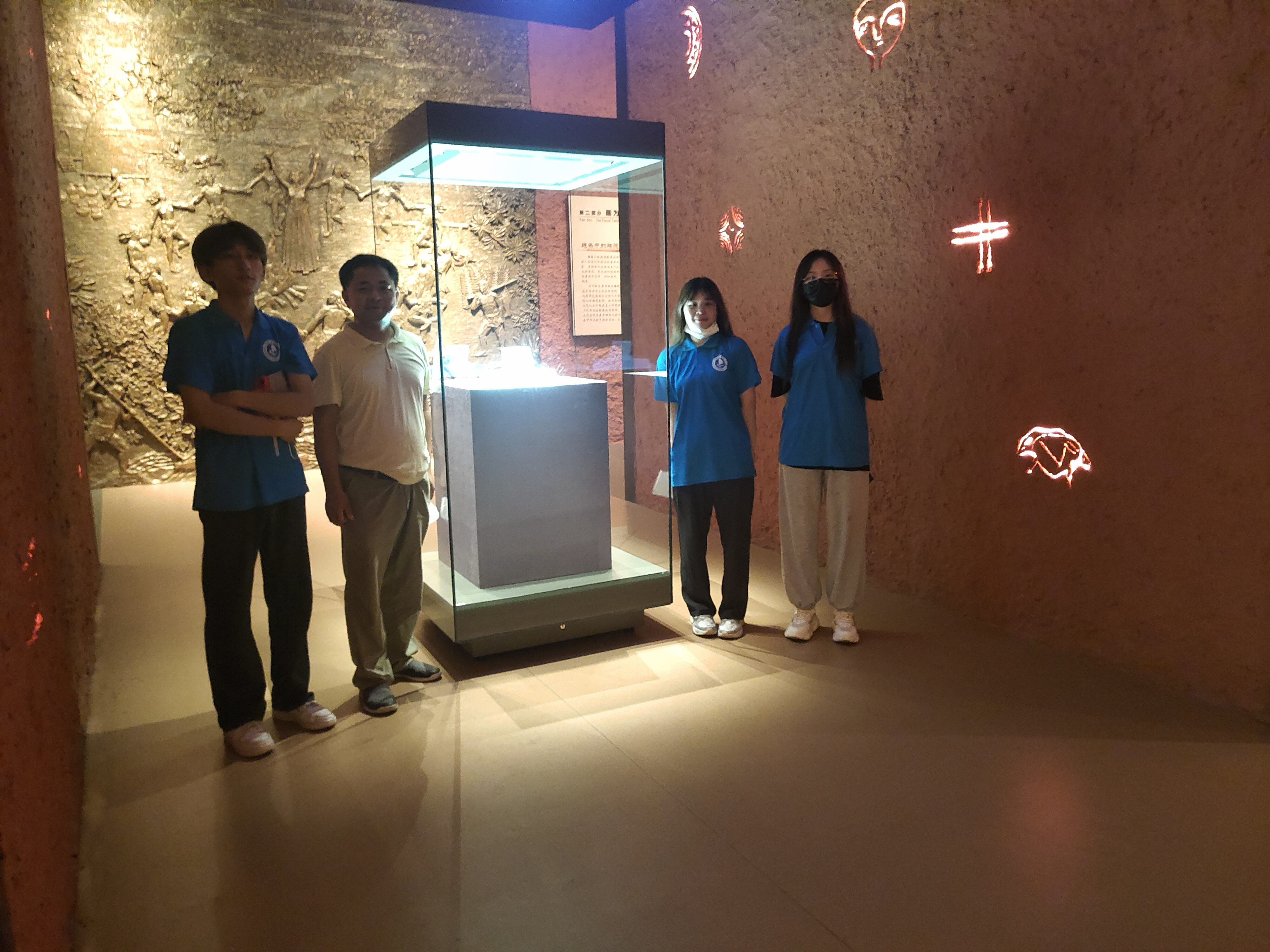 19日,团队在指导老师的带领下参观了蚌埠市博物馆,进一步了解双墩文化及出土的珍贵文物。在“孕沙成珠•蚌埠古代历史文明”陈列场馆中,大家再一次感叹蚌埠悠久的历史文化:七千年前,双墩刻划符号展现了中国文字的萌芽状态;两千六百年前,钟离君柏墓揭开了神秘的钟离古国面纱;明清时期,蚌埠社会逐渐成型。在双墩文化陶塑雕题纹面人头像专题陈列场馆,我们见到了陶塑雕题纹面人头像的真迹。作为女性神像,其美丽与清朗的精神气质体现了华夏先民对神圣的崇拜,是我国目前已发现的“雕题纹面”的最早实物例证,堪称是“最古老的微笑”。