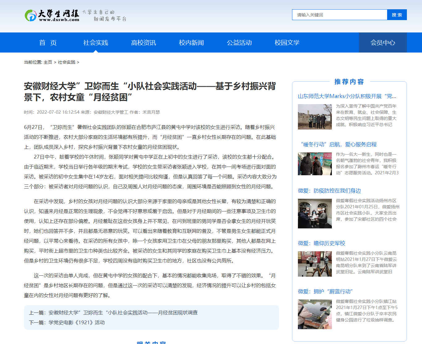 7月2日,大学生网报社会实践栏目以《73882必赢最新官网“卫妳而生”小队社会实践活动——基于乡村振兴背景下,农村女童“月经贫困”》为题报道必赢官网暑期社会实践队伍“卫妳而生”小队前往合肥市庐江县,调研乡村振兴背景下农村女童的月经贫困现状。