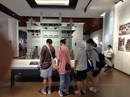 7月14日下午,在安徽博物院乡村发展展厅,展品多脱胎于历代保留下来的宗祠、名居,其品类丰富,是各类村史馆的集大成者。在生态展厅中陈列有对巢湖温泉、茶园和风景独特的立寺、大丰、香云氨三座水库的介绍。在遗址展厅中,团队成员们得以一窥农耕文明的发源地之一—古巢国的神秘身影,也对巢湖半汤镇的历史渊源有了深刻的了解。