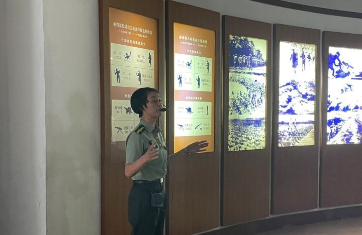 在进入场馆后,团队成员跟随讲解员了解到纪念馆分为旧址区和陈列厅,旧址区有邓小平旧居、张震旧居等、司令部会议室和大食堂,复原和再现了领导人在孙家圩子工作及生活的场景。陈列厅通过将星耀珠城、淮畔定方略、决胜千里外、利剑向江南、送军过长江五大部分,包括各类实物、历史图片、美术作品以及图表、模型和场景等,丰富而系统地展示了蚌埠人民支援渡江作战的过程。走进纪念馆,就被它淳朴简洁的布展风格吸引,墙面是泥土注浆的凝重感,或有藤木枝干倚墙而立,像乡间旧时庭院。而墙面所有讲述或图文再现都是一波波的浪涛,推动历史的大潮。出口处还陈列了当时作战用的武器,迫击炮、手榴弹、步枪等。看到这些仿佛穿越时空和他们一起作战一样!同时队员们还参观了邓小平和陈毅的旧居。旧居为茅草土房,简洁干净。邓小平旧居与陈毅旧居毗邻而立,属于屋连屋、山搭山的邻居。