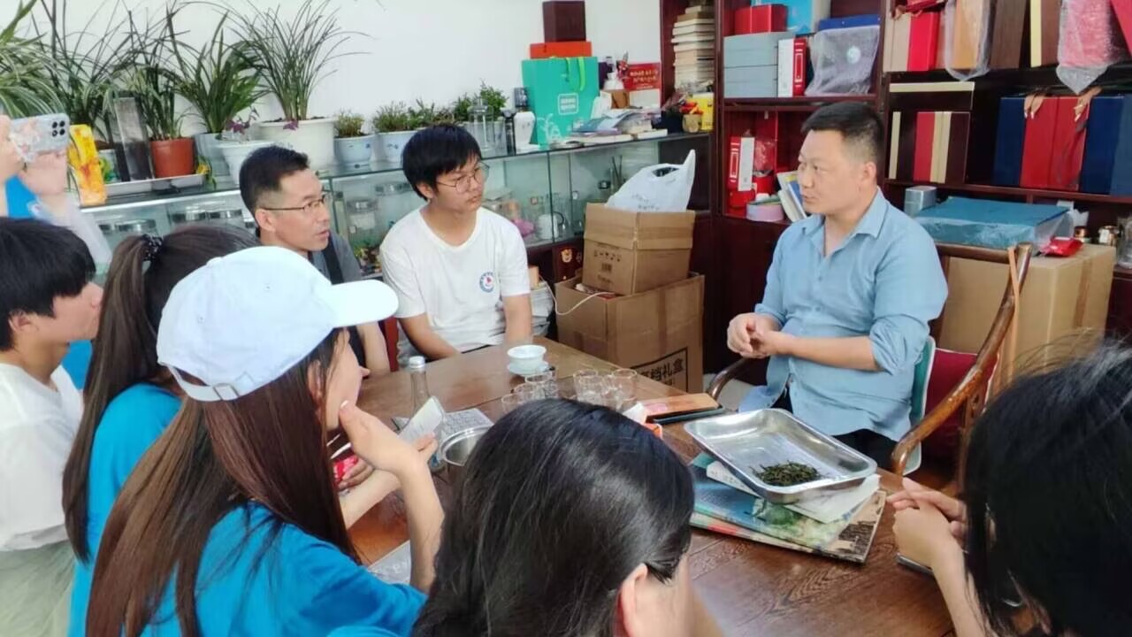 79日上午,团队前往中国大别山绿色商城调研当地黄茶市场现状成员在指导老师的带领下,走进一家家茶叶店铺进行调研访谈。团队成员了解到黄茶由于制作的繁琐保存的条件苛刻等原因,每年只会在特定季节进行销售,受众较小,这就意味着霍山黄茶的消费结构转型尤为重要,宣传力度也需进一步加强。下午,团队与省级非物质文化遗产黄茶制作技艺代表性传承人——衡永志老师进行交流。衡老师为团队成员细致讲述霍山黄茶历史文化、制作工艺以及传承创新,并希望更多的年轻人参与霍山黄茶文化传承中,让霍山黄茶为更多人知晓。
