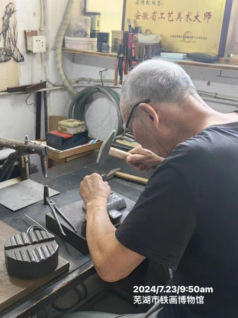 团队首先进入铁画展览区,映入眼帘的是精美的各色铁画样式以及各型各样的铁质工艺品。每幅铁画都有对应的解说文字,团队能够很好地了解其历史及创作来源。铁画的创作类型包含传统和现代两种不同的元素,审美更加多元化。紧接着,团队步入铁画及工艺品制作车间。在那里,团队更加近距离观察了铁画的制作。团队经过观察学习了解到,铁画的制作过程十分烦琐,工匠们以精选的铁皮为材料,经过数万次捶打,由线到体、从构建到组合、从雏形到成型,以锤为笔、以铁为墨,最终成就了一幅幅精美的铁画。团队成员还有幸采访到了铁画传承人汤传松老先生,在交谈中,成员们对铁画的历史及铁画与工匠间的故事有了更加深刻地了解,并对如何传承经典、实现良好创新有了更广阔的思路。