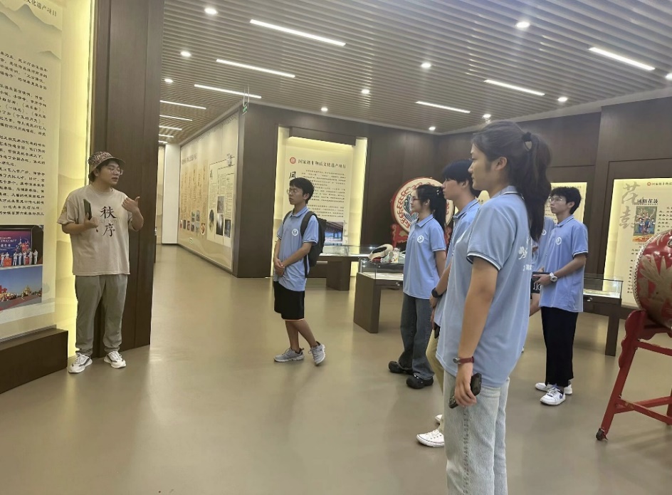 抵达凤阳县后,团队首先来到当地花鼓传承基地,通过参观基地内的一系列现代化成果展示,追寻前辈们在面对非遗文化逐渐淡出人们视线的残酷社会现状下的艰辛的传承过程,并就凤阳花鼓前世今代的改革创新与讲解员展开讨论,探讨未来凤阳花鼓等非遗文化如何更好创新数字化传承。