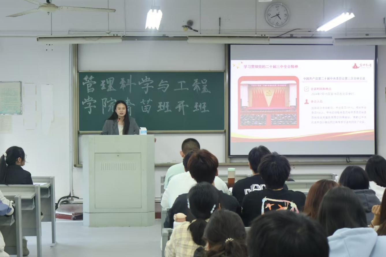 开班仪式上,丁莹在致辞中深刻阐述了团课学习和共青团员成长的重要意义,指出在新时代,共青团员作为党的助手和后备军,肩负着重大的历史使命。随后,她以“贯彻落实党的二十届三中全会精神”为主题,结合大学生学习生活实际,从“科教兴国、人才强国”“未来就业”等方面进行深入讲解。