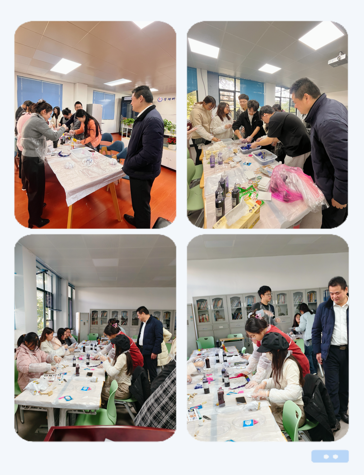 活动伊始,由张誉同学向大家简要介绍了活动的背景与目的,并为同学们演示了扎染的基本步骤。在广学楼211教室,学生们热情高涨,从扎结到染色,每一个环节都充满了浓厚的兴趣和创作激情。大家细心地感受着扎染这一传统手工艺的魅力,尝试着用自己的双手将布料变成一幅幅独特的艺术作品。在另一侧“教工小家”的老师们也在围绕扎染这一主题展开交流与创作,大家分享着各自的创作灵感,互相传授技巧,现场气氛温馨而活跃。通过这次活动,不仅让大家领略到了扎染的艺术魅力,也增进了师生之间的互动与交流。
